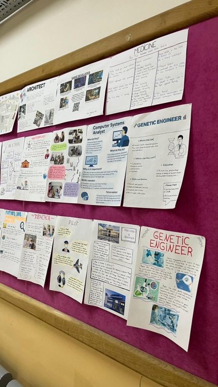 From astronaut to teacher, from doctor to technology expert, a wide variety of career dreams came to life on their posters. This project allowed students to both practice their English skills and share their visions for the future.